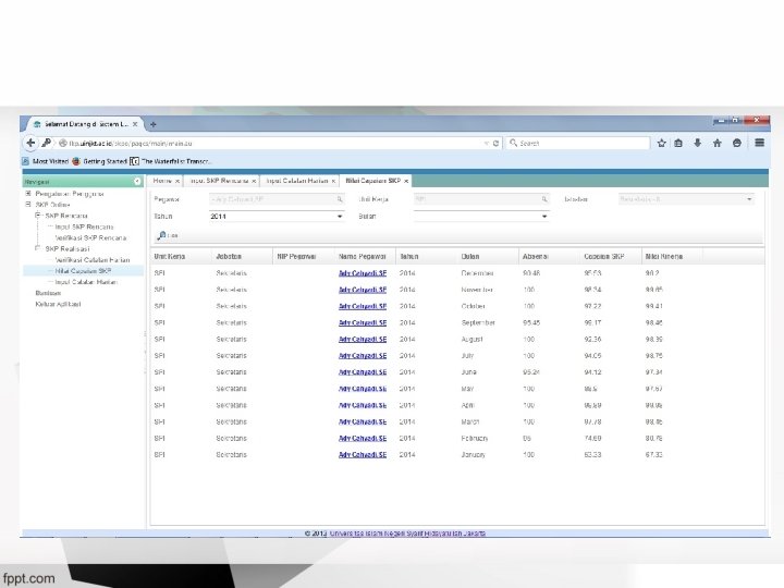 Pengertian LKP dan Absensi (Modifikasi UIN) LKP (70%) Absensi (30%) • Rencana kerja dan target yang akan dicapai oleh pegawai. • Jumlah Hari efektif Kerja dalam 1 Bulan.