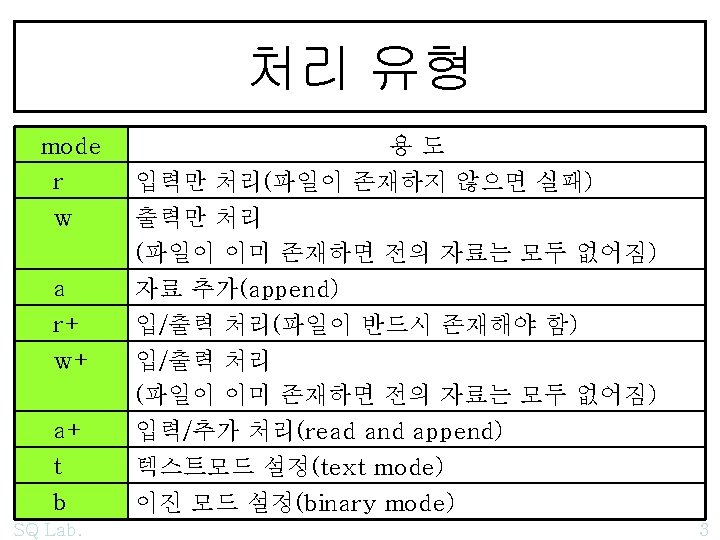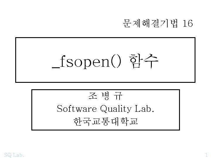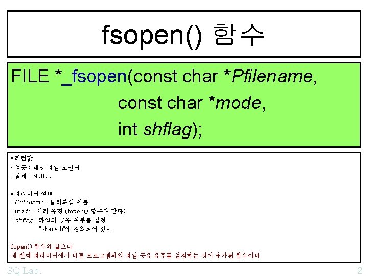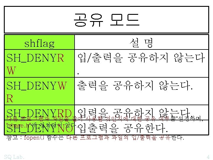 SHDENYxx 001 002 003 004 005 006 007 Slides: 7 Download presentation 예제 : SH_DENYxx /*001*/ /*002*/ /*003*/ /*004*/ /*005*/ /*006*/ /*007*/ /*008*/ /*009*/ SQ Lab. /* fsopen 01 SH_DENYxx 01 */ #include "stdio. h" #include "stdlib. h" #include "string. h" #include "share. h" /* SH_DENYRW */ #pragma warning(push, 2) 5 /*010*/ void main() /*011*/ { /*012*/ FILE *file 01; /*013*/ file 01 = _fsopen("c: \files\SH_DENYxx 01. txt", "r", /*014*/ SH_DENYRW); /*015*/ if(file 01 == NULL) /*016*/ { /*017*/ printf("n open() error : (%i)%s", errno, strerror(errno)); /*018*/ getchar(); /*019*/ exit(0); /*020*/ } /*021*/ [참고] /*014*/ SQ Lab. SH_DENYRD); SH_DENYWR); SH_DENYNO); 6 /*022*/ puts(""); /*023*/ char buffer[45]; /*024*/ /*025*/ do /*026*/ { /*027*/ fread(buffer, 45, 1, file 01); /*028*/ buffer[44] = '