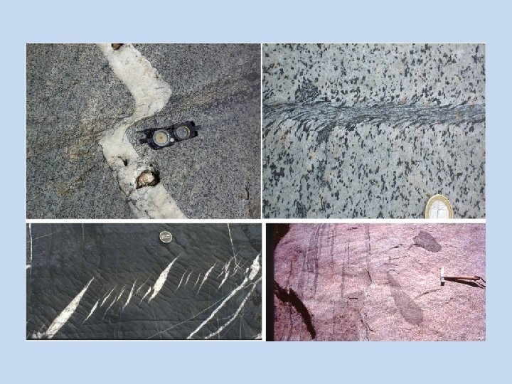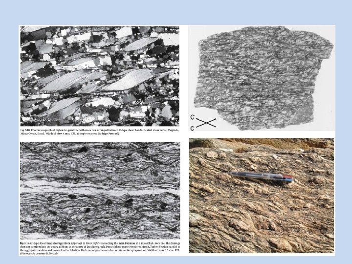Shear zones In generale la deformazione nelle rocce non è mai distribuita in modo omogeneo. Molto spesso si concentra in zone ristrette chiamate zone di taglio o shear zones. Tali zone sono un’importante sorgente di informazioni geologiche perché la deformazione causa lo sviluppo di fabric e associazioni mineralogiche caratteristiche riflettono le condizioni P-T, il tipo di flusso (deformazione), il senso di movimento e la storia deformativa. Le shear zone possono essere suddivise in zone fragili o faglie e zone duttili. Quest’ultime sono attive in condizioni da bassissimo ad alto grado metamorfico rispetto alle prime.