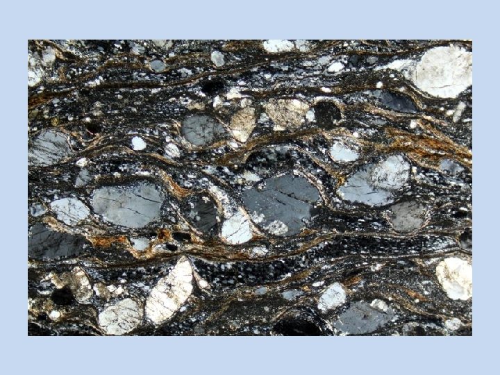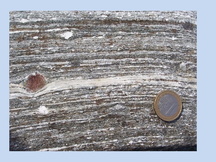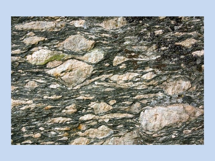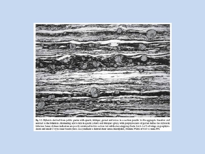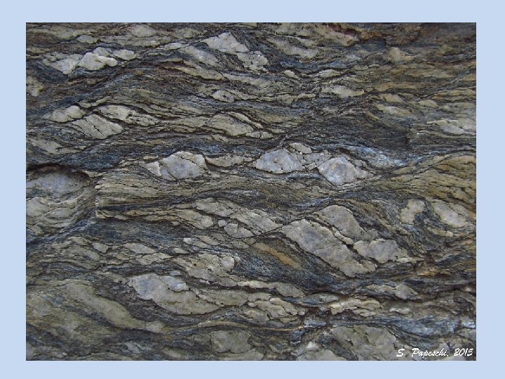 Shear zone duttili e miloniti Queste zone di taglio, se viste lungo una sezione ortogonale ai bordi e parallela alla direzione di taglio, si presentano generalmente caratterizzate da una foliazione tettonica con andamento sigmoidale. Nella maggior parte dei casi la deformazione non è omogenea ma l’intensità varia passando da un bordo all’altro con il massimo della deformazione duttile nella parte centrale della shear zone. Dove la deformazione raggiunge valori molto alti, lungo la foliazione, si osserva una lineazione tettonica definita come lineazione di allungamento. Questa lineazione può essere evidenziata dall’allineamento di minerali lunghi ruotati durante la deformazione oppure, se le condizioni di P e T lo permettono, dalla isorientazione di minerali metamorfici di neoformazione con habitus allungato. Spesso le zone di taglio duttili si presentano in sistemi che possono anche essere anastomizzanti.