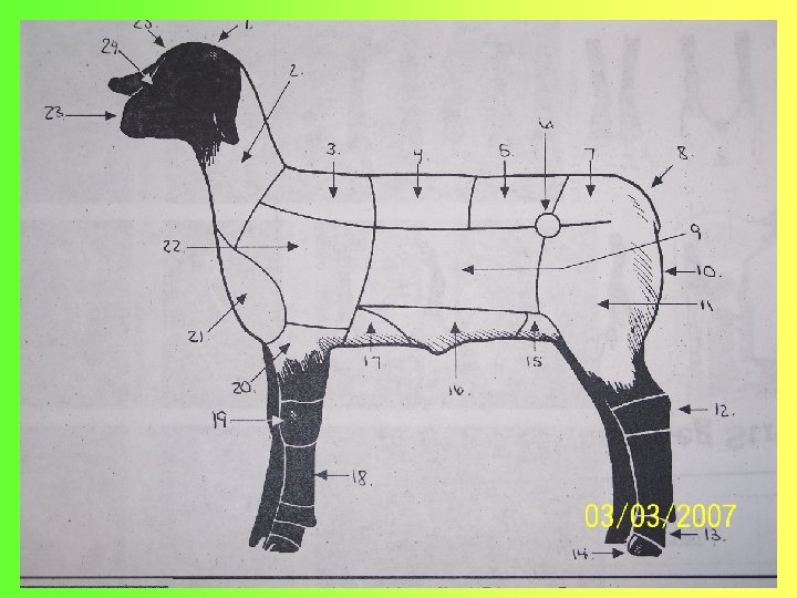 Sheep Parts 1. 2. 3. 4. 5. 6. 7. 8. 9. 10. 11. 12. 13. Muzzle Face forehead poll Neck Top of shoulder Back or rack Loin Hip Rump Dock Middle Twist 14. Leg 15. Hock 16. Pastern 17. Hoof 18. Rear flank 19. Belly 20. For flank 21. Cannon 22. Knee 23. Forearm 24. Breast or brisket 25. Shoulder
