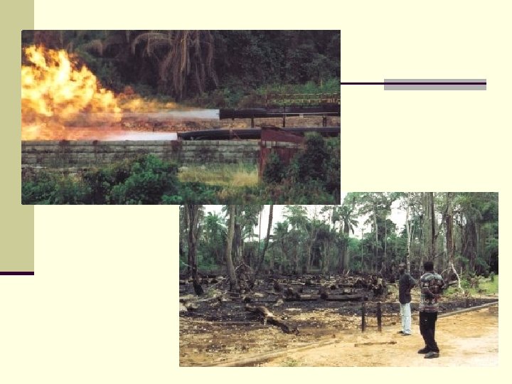 Analysis n The first thing they had to do was attempt to clean up and restore the land from all of the degradation the company has caused it. Shell Oil Company built oil pipelines through people’s farmlands and property that leaked and caused not only death to the vegetation but to the surrounding land. n These large amounts of carbon dioxide burning in the air can cause serious problems for younger children and even those with asthma problems depend on how close and thick the smoke is n