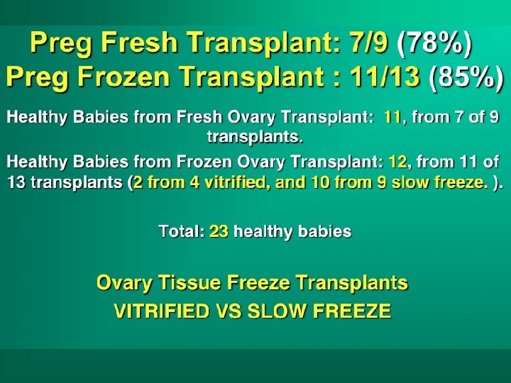 Ovary Tissue Freeze Transplants VITRIFIED VS SLOW FREEZE Slow Freeze Vitrified 9 Cases 4 Cases 7 Babies (+4 Ongoing) 2 Babies 11 Pregnancies 2 Pregnancies 1 Miscarriage 0 Miscarriage