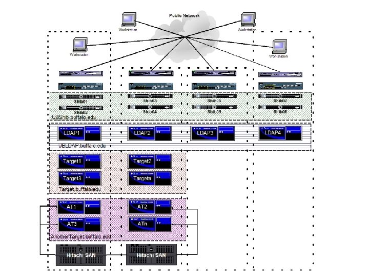 Hardware o UB Historically a Sun shop o Started with 4 Sun V 120 s o Moved to 4 Sun 280 Rs n n Dual CPU Sun Crypto Accelerator cards o Performance still CPU bound o Moved to Linux on 2 “borrowed” Dell 6650 s (used the 280 s for our LDAP)