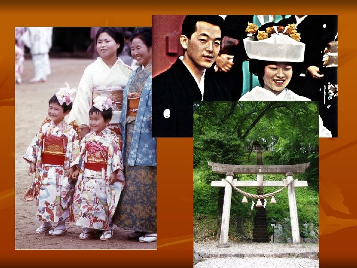 Practices n Shinto does not have weekly religious services. Some may go to the shrines on the 1 st and 15 th of each month and on the occasions of rites or festivals (matsuri), which take place at fixed times during the year n n n including a baby’s first visit to its tutelary kami soon after birth, the Shichi-go-san (Seven-Five-Three) festival on Nov 15 th where three and seven year old girls and five year old boys go to pray for good health, and the traditional wedding ceremony.