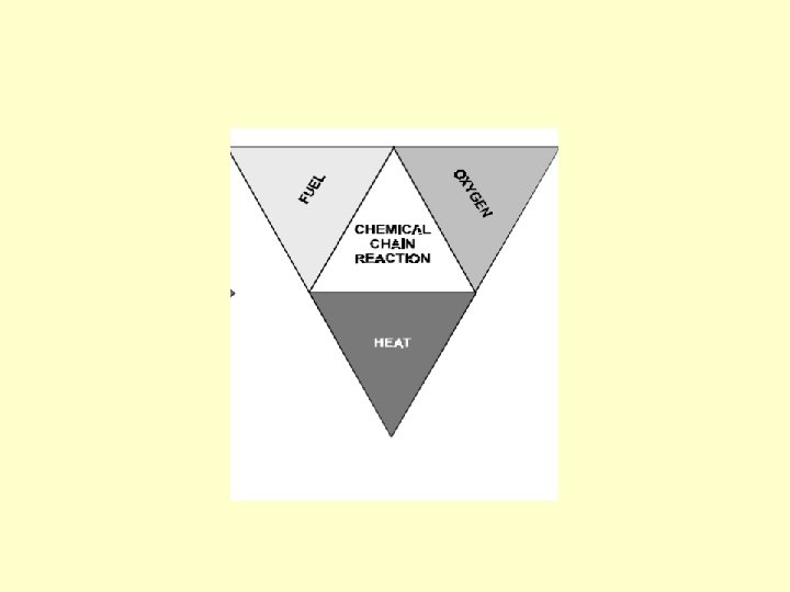 Each of these three elements must be present at the same time to have a fire. A fire will burn until one or more of the elements is removed. Fuel Any combustible material – solid, liquid or gas Oxygen The air we breathe is about 21% oxygen – fire needs only 16% oxygen Heat The energy necessary to increase the temperature of fuel to where sufficient vapors are given off for ignition to occur