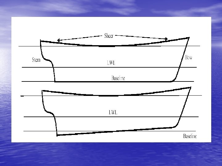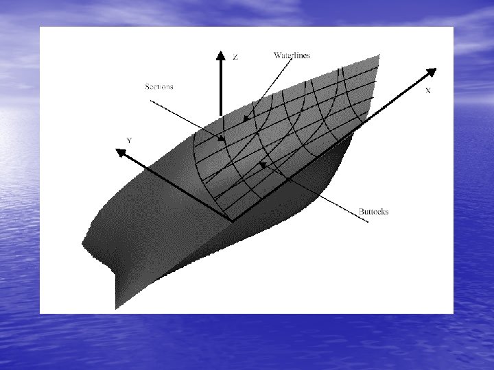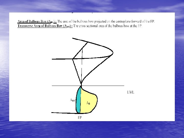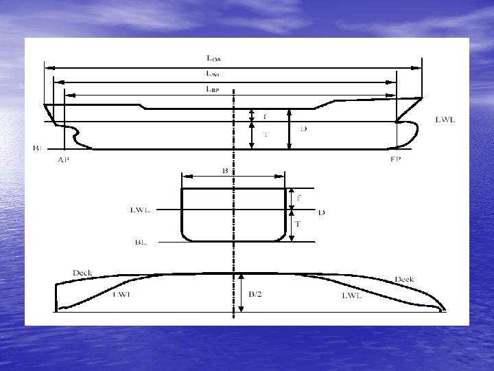 • Hull: The structural body of a ship including shell plating, framing, • • • decks and bulkheads. Afterbody : That portion of a ship’s hull abaft midships. Forebody: That portion of a ship’s hull forward midships. Bow : The forward of the ship Stern : The after end of the ship Port : The left side of the ship when looking forward Starboard : The right side of the ship when looking forward Design Waterline (DWL) or Load Waterline (LWL) : The waterline at which the ship will float when loaded to its designed draught. Moulded Surface : The inside surface of the skin, or plating, of a ship. Forward Perpendicular (FP) : The vertical line at the point of intersection of the LWL and the forward end of the immersed part of the ship’s hull. After Perpendicular (AP) : The vertical line at the point of intersection of the LWL and the centerline of the rudderstock. Midships () : The point midway between the forward and after perpendiculars.