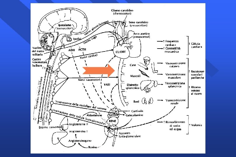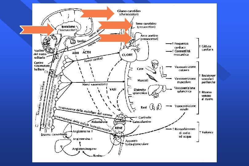 Risposta neuroendocrina • • • Barocettori (seno carotideo, arco aortico): PA volocettori (atriali): V riempimento atriale chemocettori (glomo): p. O 2, CO 2 Osmocettori (ipotalamo): osmolarita’ plasmatica Nocicettori (cutanei, viscerali, scheletrici)