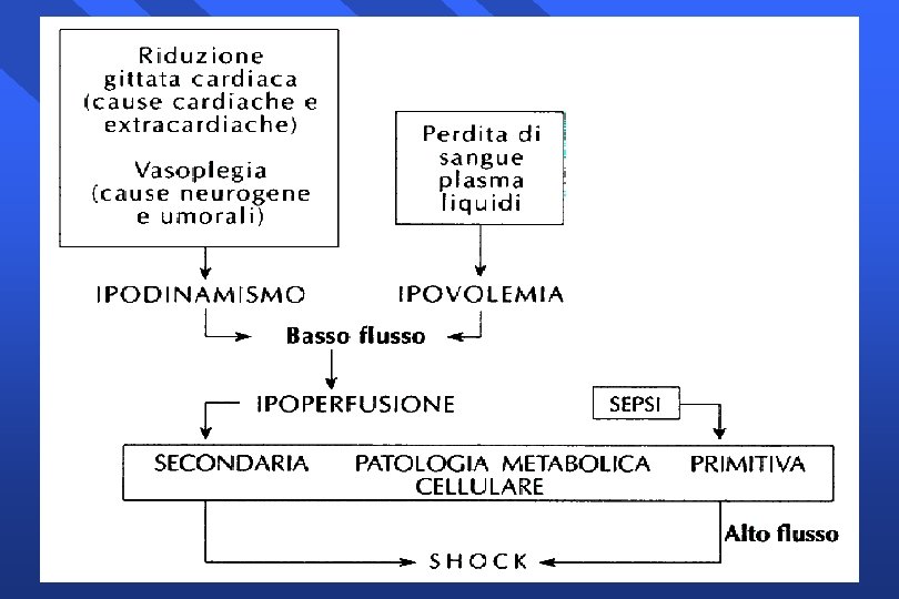 SHOCK • 1) inadeguato trasporto e/o disponibilita’ O 2 (< flusso sanguigno) • 2) alterazione primitiva utilizzo O 2 a livello cellulare (sepsi)