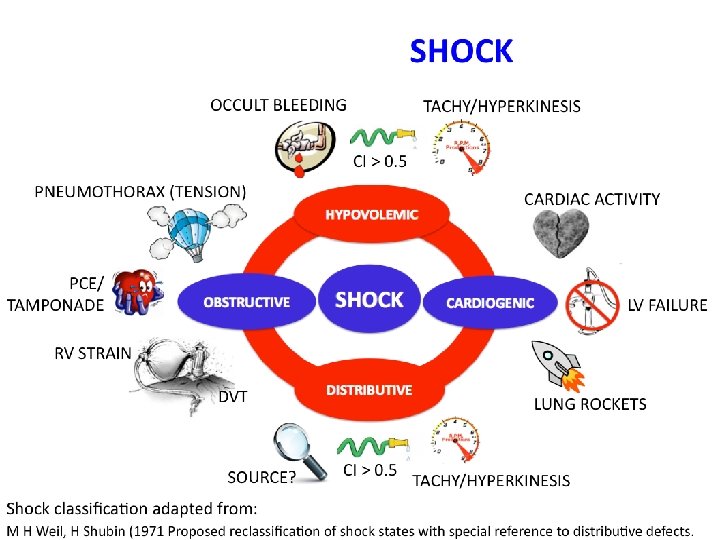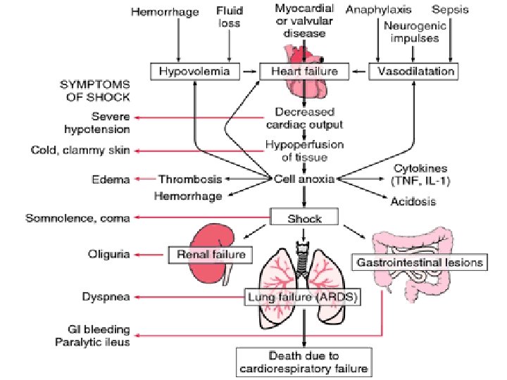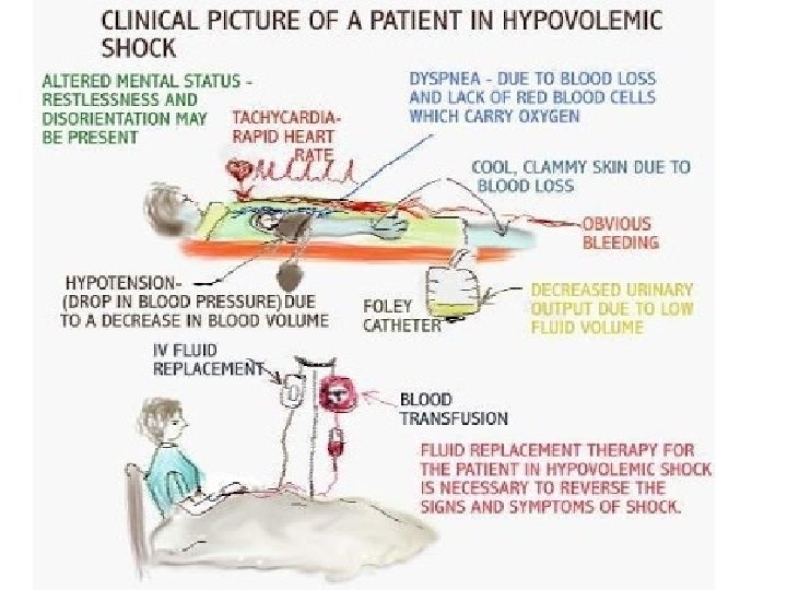 KUADRI KLINIK - Crregullimet e hershme jane ato ne lekure qe i detyrohen vazokonstriksionit periferik, anesite e ftohta, djerse, zbehje ose cianoze, - ulje e TA, - puls i shpejte, i dobet, - shenja respiratore takipne, - diureze e pakesuar deri ne anuri, - shfaqen crregullime psikike nga anoxia cerebrale si ankth, axhitim, - konfuzion deri ne kome - - - shenja te tjera klasifikohen sipas shkakut.