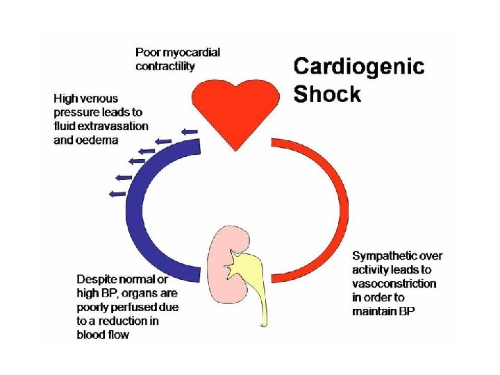 1 - KOLAPSI DHE SHOKU CENTRAL/KARDIOGJENIK shkaktohen nga prekja primare e pompes kardiake a) - Probleme te hedhjes sistolike MI (nekroza >40%) Rupture e zemres (tamponade) Asistoli b) Probleme te mbushjes diastolike - Perikarditet me likid te shumte dhe te formuar shpejt - Hemo-perikardit (tamponade) - Crregullimet e ritmit, takikardi, bradikardi - Emboli pulmonare masive (demtohet 70% e shtratit vaskular masiv)