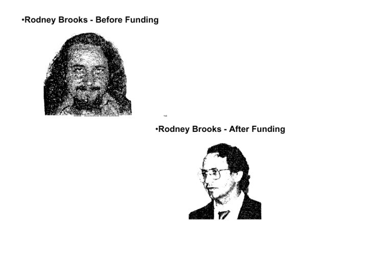 Rodney A. Brooks • Born in Adelaide, Australia in 1954 • Received Ph. D in computer science from Stanford University • Member of the M. I. T Artificial Intelligence Lab where he leads the mobile robot group. • Well funded to do research in autonomous vehicles. ($$$$)