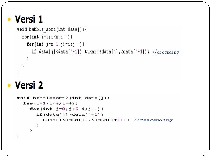 Buble Short � Pengurutan Ascending : Jika elemen sekarang lebih besar dari elemen berikutnya maka kedua elemen tersebut ditukar. � Pengurutan Descending: Jika elemen sekarang lebih kecil cari elemen berikutnya, maka kedua elemen tersebut ditukar. � Algoritma ini seolah-olah menggeser satu per satu elemen dari kanan ke kiri atau kiri ke kanan, tergantung jenis pengurutannya, asc atau desc. � Ketika satu proses telah selesai, maka bubble sort akan mengulangi proses, demikian seterusnya sampai dengan iterasi sebanyak n-1. � Kapan berhentinya? Bubble sort berhenti jika seluruh array telah diperiksa dan tidak ada pertukaran lagi