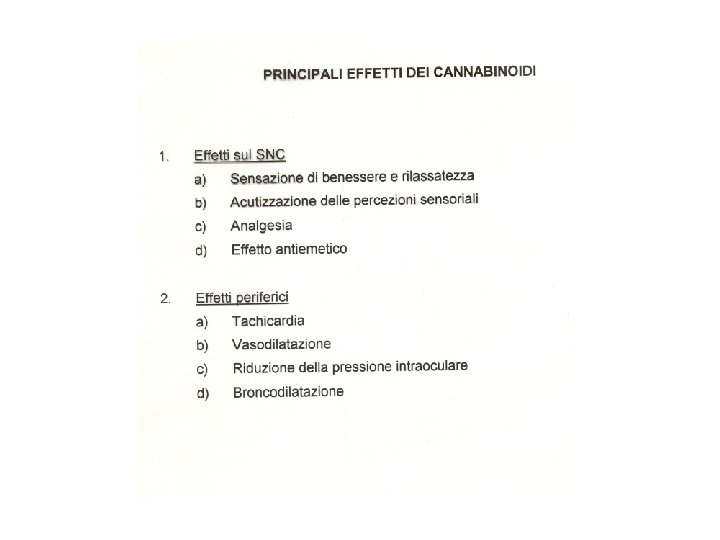 POSSIBILI IMPIEGHI TERAPEUTICI DEI CANNABINOIDI Riduzione della pressione endo-oculare nel glaucoma Effetto antiemetico Effetto analgesico Aumento dell’appetito