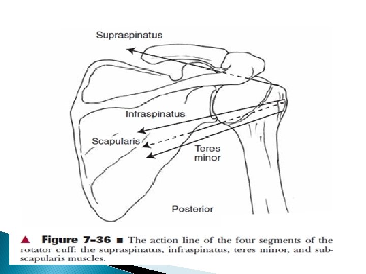 Infraspinatus, Teres Minor, & Subscapularis � Infraspinatus & Teres minor are external rotators of GH joint & subscapularis is an internal rotator � Lateral rotation is required during abduction to clear the greater tuberosity from under the coracoacromial arch. The medial rotatory function of the subscapularis muscle decreases with abduction.