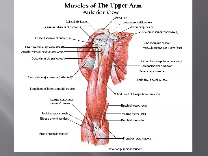 Contusion to Upper Arm (Deltoid – Most Common) � � Precautions-prevent the possibility of myositis ossificans (calcium formation from repetitive trauma) Mechanism � � � Signs and Symptoms � � � Direct blow Fall on arm Point tenderness and swelling over area Pain on palpation and active ROM Bruising and possible limp in muscle belly Possible a decreased ROM Treatment � � � Ice Padding and protection Strengthening exercises