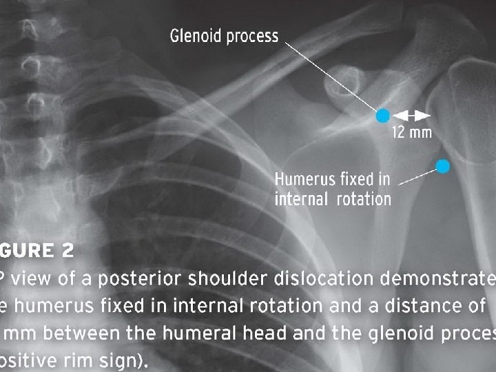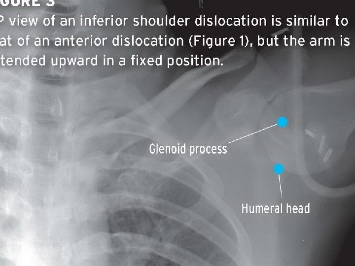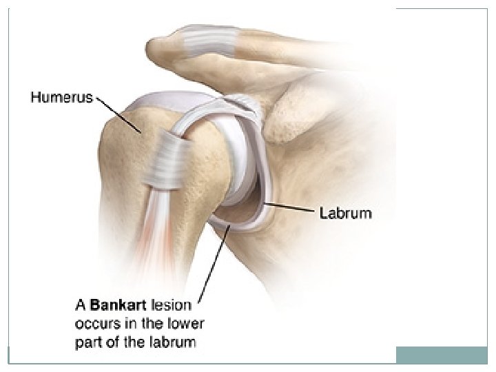 Lesions that are commonly seen with an anterior dislocation include the Hill-Sachs fracture and the Bankart fracture. A Hill-Sachs fracture is a fracture of the humeral head. It occurs along the posterior and superior aspect and is caused by the impaction of the humeral head on the inferior aspect of the glenoid process. A Bankart fracture is caused by the same mechanism, but it is a fracture of the inferior aspect of the glenoid process.