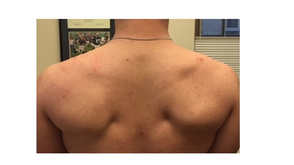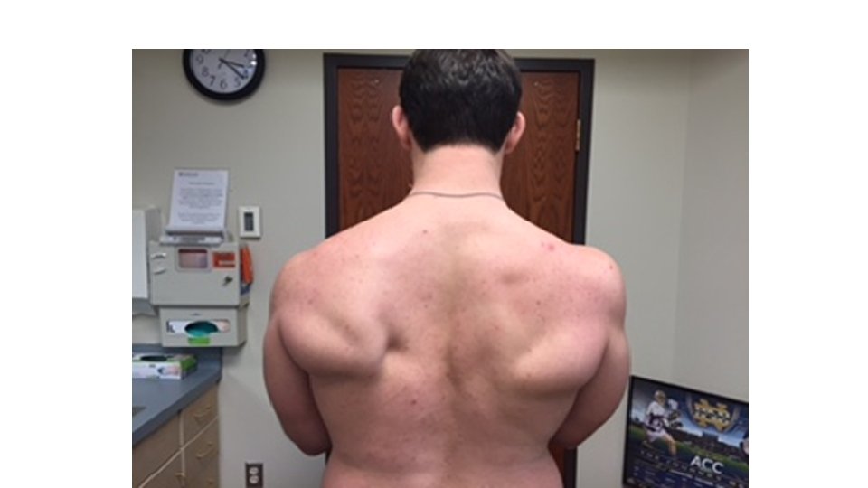 Follow up • The patient returned for follow up after Christmas Break. Generally, he was better. He had begun weight lifting at home but noticed the pain returning at a different location: his posterior scapular region. He also noted that he was weaker with certain motions. He denied any numbness, tingling or recurrent dead arm syndrome. Examination confirmed weakness to external shoulder rotation. Hawkins and O’Briens tests were unrevealing. No shoulder laxity identified in this heavily muscled athlete.