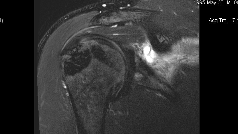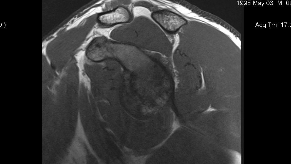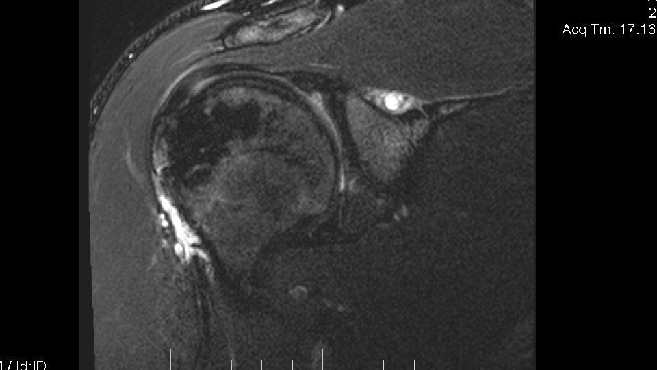 Patient History • This 21 yo male All-American Rugby player and a former High School state champion wrestler presented on Dec 4, 2015 for evaluation of generalized right shoulder pain. There was no history, past or present, of a specific shoulder injury, but the athlete had recreationally wrestled a few nights before and lifted weights prior to his visit. He complained of a dead arm sensation of his right arm and generalized discomfort globally in the shoulder. Motion was limited secondary to pain but no focal muscle weakness was present. The patient had a positive Hawkins, a positive O’Brien’s test thumb up and thumb down, a positive apprehension sign, and no gleno-humeral laxity. The patient was given diclofenac and scheduled for follow-up.