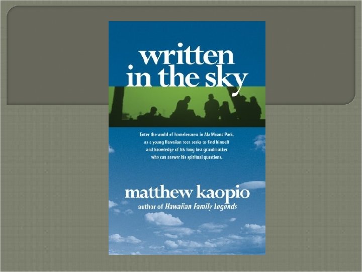 Gist of Book �Main character has lost his family �Hawaiian ancestry �Homeless on streets of Oahu �Learns about self and family while on his journey on streets �Aumakua �Think about your quick write and what you thought about homelessness while you read this book!!