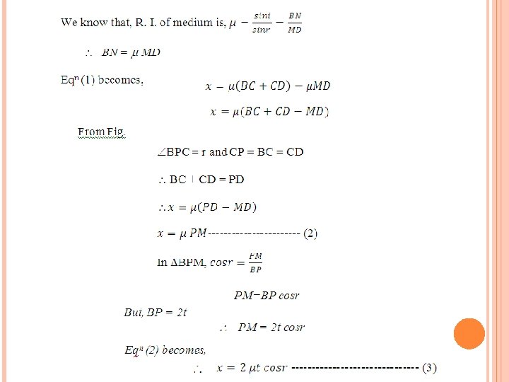 As angle of incidence is small, cosr = 1. For air, = 1 and t = Pn. Qn (1) The next bright fringe (n+1) will occur at Pn+1, such that Subtracting eqn (1) from eqn (2)