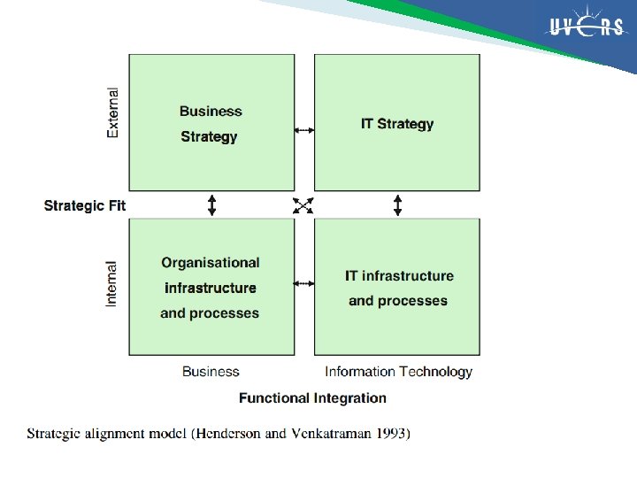 Faktor internal Penyesuaian Bisnis-TI dianggap sebagai instrumen penting untuk mewujudkan efektifitas organisasi. � Model penyesuaian strategis oleh Henderson dan Venkatraman (1993) membedakan antara aspek strategi bisnis dan infrastruktur organisasi di satu sisi, dengan strategi dan infrastruktur TI di sisi lainnya. � Model ini menyediakan 4 sudut pandang dominan yang digunakan untuk mengatasi penyesuaian antara aspek 2 tersebut.