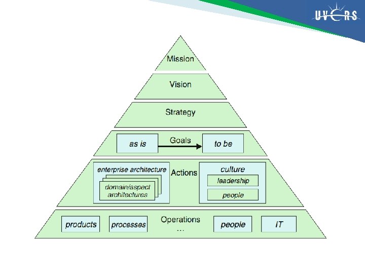 Enterprise architecture diposisikan dalam konteks pengelolaan enterprise. � Pada bagian puncak, Misi dari enterprise adalah: mengapa ada? Visi menyatakan ‘gambaran masa depan’ dan nilai 2 yang dipegang teguh. � Berikutnya adalah strategi, yang menyatakan jalur yang ditempuh enterprise untuk mencapai misi dan visinys ditranslasikan ke dalam tujuan konkrit yang memberi arah dan menjadi penanda dalam mengeksekusi strategi.