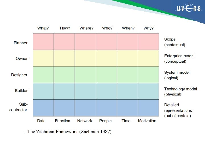 Zachman Framework � Tahun 1987, John Zachman memperkenalkan framework enterprise architecture yang pertama dan terkenal, walaupun pada saat ini dikenal sebagai ‘Framework for Information Systems Architecture’. � Framework yang berlaku untuk enterprise pada dasarnya adalah sebuah struktur logis untuk mengklasifikasi dan mengorganisasi representasi deskriptif dari sebuah enterprise yang penting bagi management enterprise dan bagi pengembangan sistem enterprise.