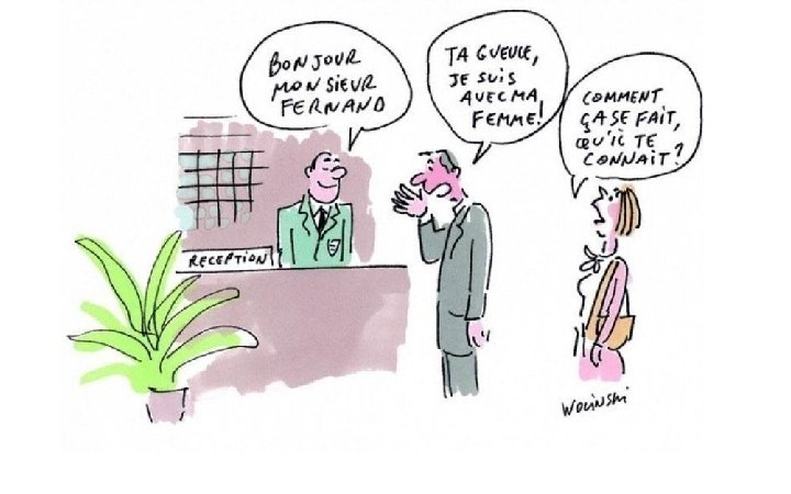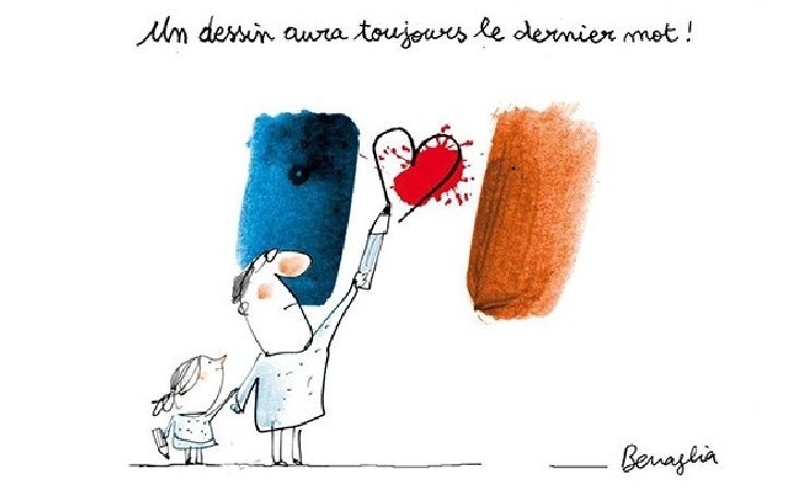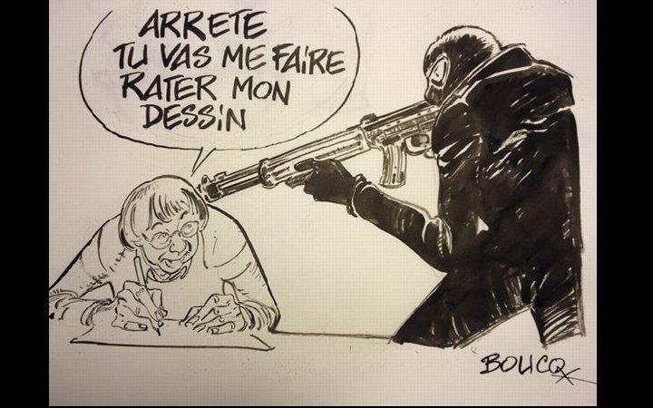Y’a du bruit partout maintenant J’ai froid d’un coup, dans ce manteau Je devrais me sentir protégé, avec Franck et Ahmed à mes côtés Dessin de Al Coutelis