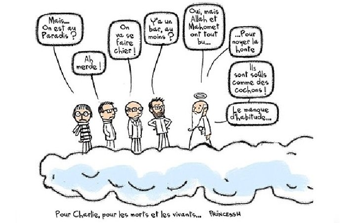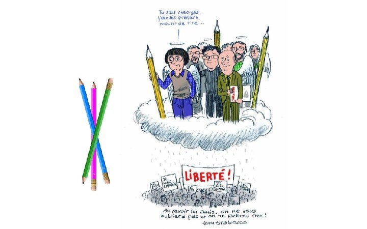 He ! Cabu, t’es déjà parti sans dire au-revoir ! Hé ! Sharb, t’es allé pisser ! Hé ! Tignous, c’est bon, fais pas le con ! Hé ! Georges, je veux bien touiller ton café ! Honoré ! Réponds s’il te plaît !