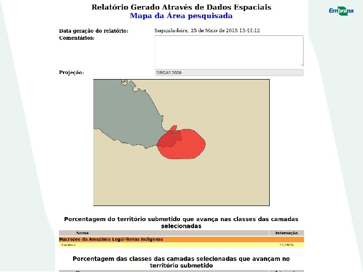 Ferramenta de Análise Espacial Módulo Bancário Geração de relatórios interativos » Permite a seleção e inclusão de um shapefile que representa a propriedade a ser pesquisada (polígono, linha, ponto) » Geração automática de um relatório de análise espacial em relação a temas específicos para cada estado da Amazônia Legal » Análise de interseção e distância da propriedade em relação às classes de cada tema