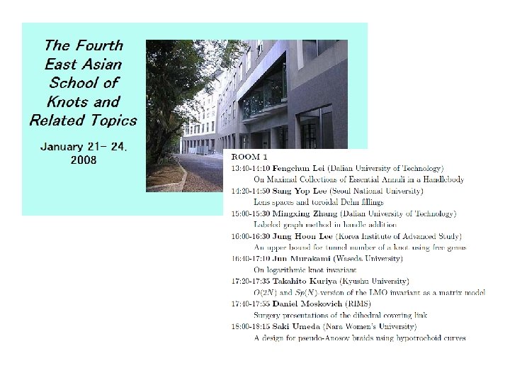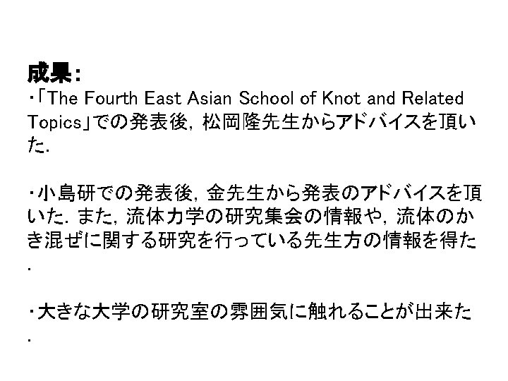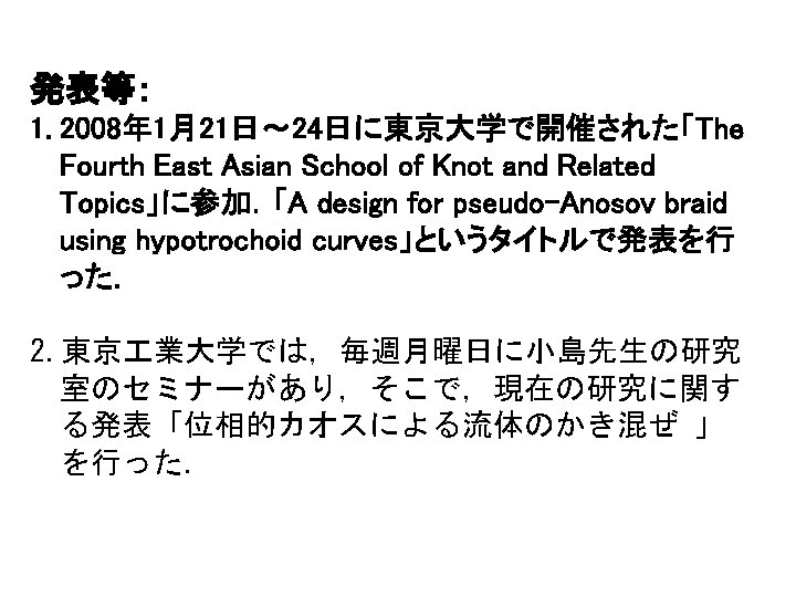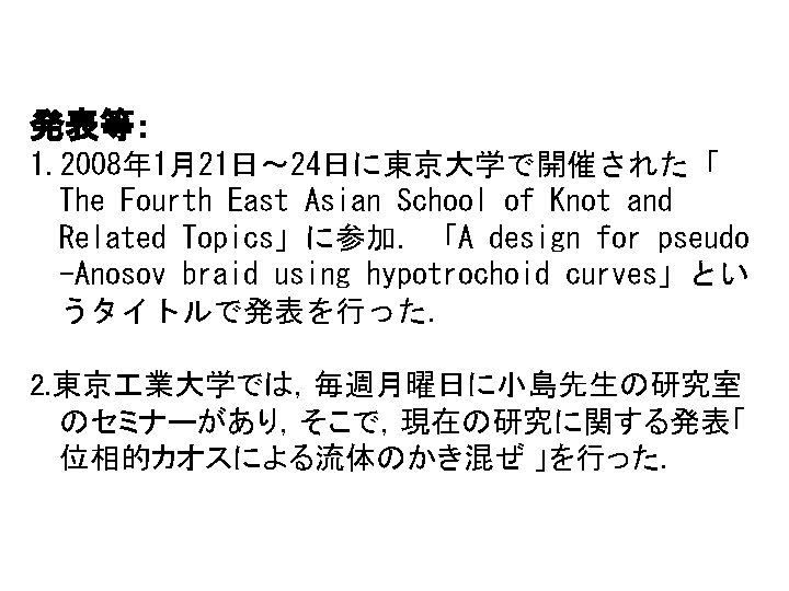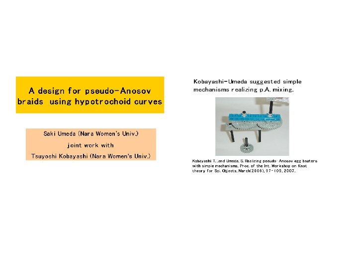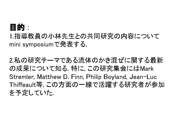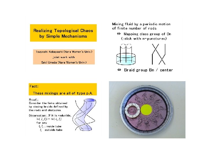 Thursday, May 31 MS 66 Topology and Mixing in Fluids 8: 30 AM - 10: 30 AM Room: Ballroom I Organizer: Mark A. Stremler Virginia Polytechnic Institute & State University Jean-Luc Thiffeault Imperial College London, United Kingdom Cancelled 8: 30 -8: 55 Designing for Topological Chaos in Fluid Mixing Phil Boyland, University of Florida 8: 30 -8: 55 Topological Chaos and Fluid Mixing in Cavities and Channels Mark A. Stremler and Jie Chen, Virginia Polytechnic Institute & State University 9: 00 -9: 25 On Braids and Topological Entropies in Spatially Periodic Flows Matthew D. Finn, University of Adelaide, Australia; Jean-Luc Thiffeault, Imperial College London, United Kingdom 9: 30 -9: 55 Realizing Topological Chaos with Simple Mechanisms Tsuyoshi Kobayashi, Nara Women's University, Japan 10: 00 -10: 25 Braid Theory and Microparticle Dynamics in Ferrofluids Kai de Lange Kristiansen , University of California, Santa Barbara