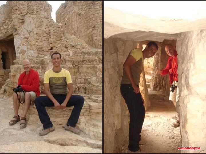 • PRENDIAMO UN FUORISTRADA E CI AVVIAMO AL LAGO MUJAZIN … NIENTE DI SORPRENDENTE FORSE PERCHE’ GIA MI E’ CAPITATO DI VEDERE LAGHI NEL DESERTO VERAMENTE SPETTACOLARI , GRANDI E SUGGESTIVI, COMUNQUE VALE SEMPRE LA PENA VEDERE TUTTO CIO CHE E’ POSSIBILE. • CAMBIAMO DIREZIONE E CI AVVIAMO VERSO IL CONFINE CON L’ALGERIA VERSO LE GRANDI DUNE DELL’ERG ALGERINO ANDIAMO AL QASR AL-GHUL “ LA MONTAGNA DEGLI SPETTRI “. LE ROVINE DEL CASTELLO SEMBRANO FUSE CON LA ROCCIA … SI SALE FINO AGLI SPALTI DI QUESTA ROCCA PER SCOPRIRE UN SISTEMA DI GALLERIE INTERRATE, POZZI D’ ACQUA FRANATI , E UNA PODEROSA CINTA MURARIA … I PANORAMI SPLENDIDI VISTI DALL’ALTO VALGONO LA PENA DELLA SALITA SULLA PICCOLA MONTAGNA DA LI VEDI LE DUNE DEL DESERTO ALGERINO E TUNISINO. • LASCIAMO LA MONTAGNA DEGLI SPETTRI E CI AVVIAMO SEMPRE CON IL FUORISTRADA VERSO LE DUNE ALGERINE … LI ABBIAMO ASPETTATO IL CALAR DEL SOLE FATTO DUE FOTO E POI SOTTO UN GROSSO TENDONE ARABESCO ( PER TURISTI) ABBIAMO MANGIATO PANE COTTO SOTTO LA SABBIA E BEVUTO IL THE VERDE. • ED ANCHE QUESTO GIORNO ARRIVA AL TERMINE E RIENTRIAMO IN ALBERGO.