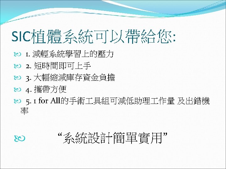 SICace Design highlights: SIC Macrodesign: Selfcutting screw design Narrow thread Reduce moment of force Increasing primary stability