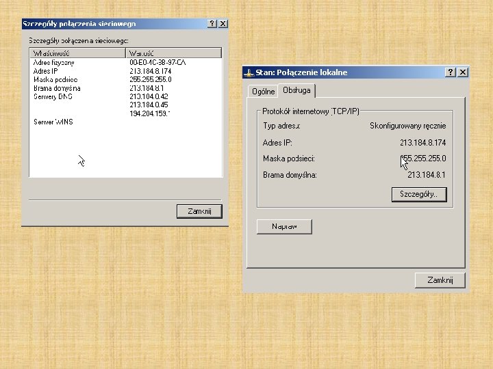 Adres IP W sieciach TCP/IP adres komputera zwany jest adresem IP. Oryginalny adres IP jest czterobajtową (32 bitową) liczbą. Przyjęła się konwencja zapisu każdego bajtu w postaci dziesiętnej i oddzielania ich kropkami. Ten sposób zapisu zwany jest notacją kropkowodziesiętną. Można jednak niekiedy spotkać inny zapis będący dziesiętnym wyrażeniem 32 bitowej liczby binarnej. Na przykład adres 148. 81. 78. 1 w notacji kropkowo dziesiętnej, będzie w postaci binarnej wyglądał następująco: 1001010001010011100001 zaś dziesiętnie będzie to liczba 2488356353. Określona liczba bitów 32 -bitowego adresu IP jest adresem sieciowym, a reszta adresem hostowym. Adres sieciowy określa sieć LAN, zaś adres hosta konkretną stację roboczą w tej sieci.