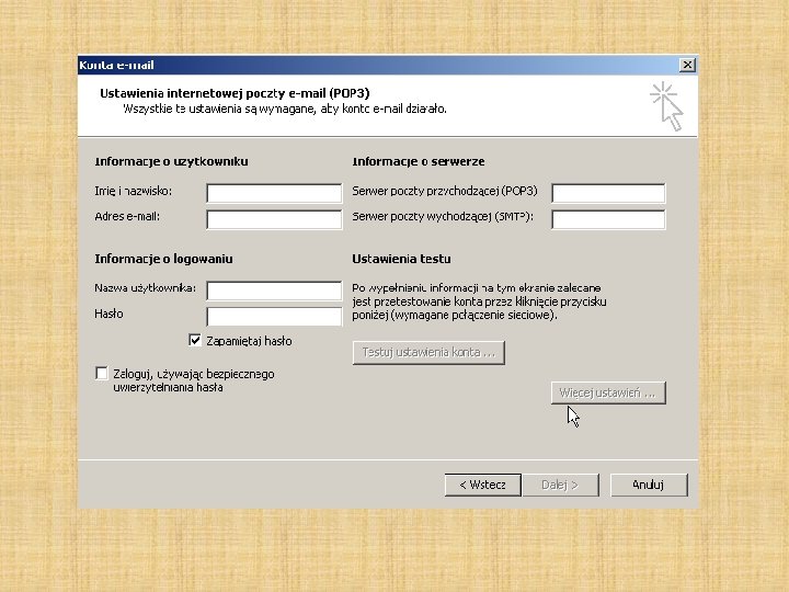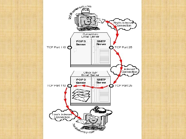 POP (Post Office Protocol) – protokół pocztowy służący do odbioru poczty z serwera i transmisję jej do maszyny lokalnej SMTP (Simple Mail Transfer Protocol) – podstawowy protokół transmisji poczty stosowany do wysyłania poczty z maszyny lokalnej na serwer