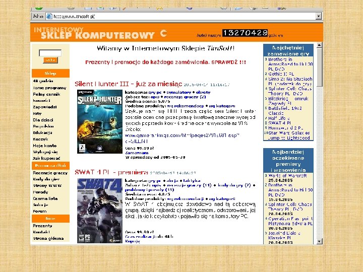 Adres URL (Uniform Resource Locator) URL jest adresem lokalizującym zasób w Internecie. Składa się z trzech głównych części: identyfikatora usługi określa m. in. następujące typy usług: http: // ftp: // gopher: // telnet: // news: // nazwy domeny może składać się z adresu domenowego lub adresu kropkowo-dziesiętnego np. www. firma. com lub 148. 81. 78. 1. Określa nazwę nadaną serwerowi lub jego adres IP ścieżki dostępu np. /tracking/ - określa ścieżkę katalogową na serwerze prowadzącą do pliku, który ma być sprowadzony.