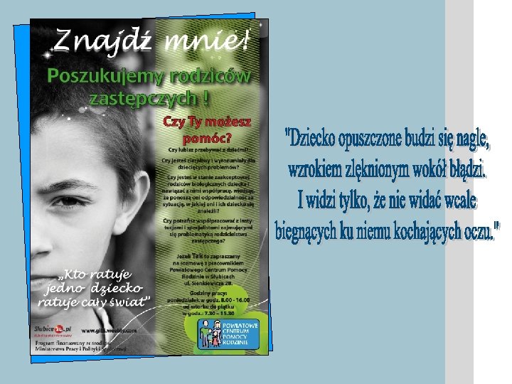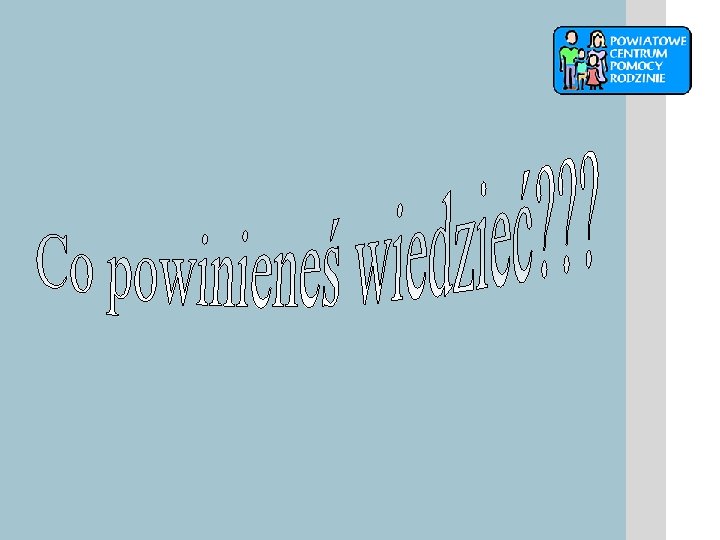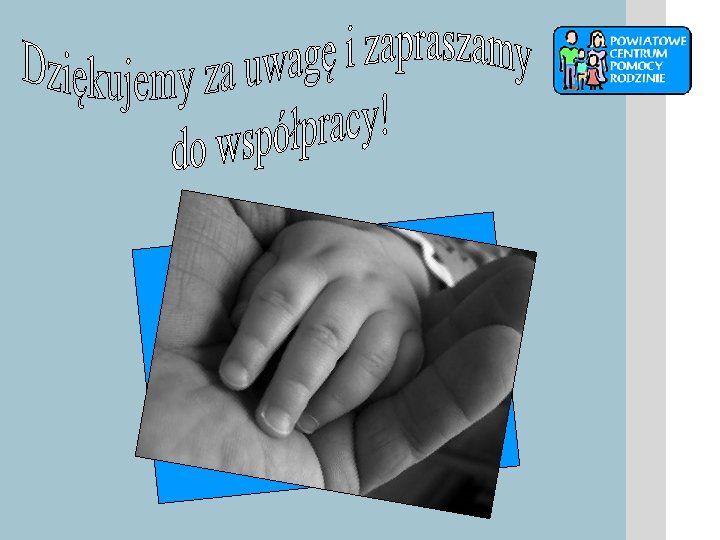 Ważne adresy, telefony, strony WWW Powiatowe Centrum Pomocy Rodzinie w Słubicach ul. Sienkiewicza 28, 69 -100 Słubice tel. 095 758 21 40, www. centrumslubice. pl Ośrodek Pomocy Społecznej Pl. Wolności 17 F, 69 -100 Słubice tel. 095 758 23 94 Ośrodek Pomocy Społecznej ul. Słubicka 30, 69 -108 Cybinka tel. 068 391 11 16 Gminny Ośrodek Pomocy Społecznej ul. Kostrzyńska 13 a, 69 -113 Górzyca tel. 095 759 15 27 Ośrodek Pomocy Społecznej Pl. Ratuszowy 1, 69 -110 Rzepin tel. 095759 65 90 Miejsko - Gminny Ośrodek Pomocy Społecznej ul. Rybacka 3 c, 69 -220 Ośno Lub. tel. 095 757 13 42 Ośrodek Adopcyjno – Opiekuńczy ul. Kazimierza Wielkiego 42 66 -400 Gorzów Wlkp. tel. 095 721 31 91 www. rodzinyzastepcze. pl www. nasz-bocian. pl www. mpips. gov. pl