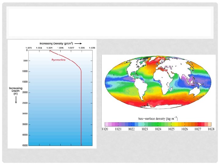 • Perubahan densitas dapat disebabkan oleh proses : • Evaporasi di permukaan laut • Di bawah lapisan ini terjadi perubahan temperatur yang cukup besar (Thermocline) dan juga salinitas (Halocline), sehingga menghasilkan pola perubahan densitas yang cukup besar (Pynocline)