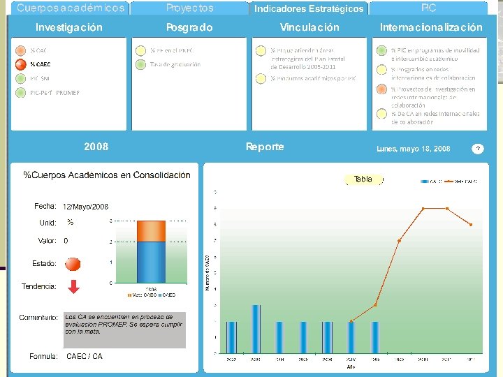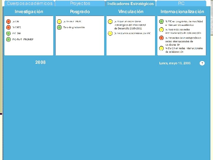 Indicadores y Tableros de Control n Seguimiento a las metas-compromiso PIFI sobre capacidad académica (CAC, CAEC, SNI, Perfil PROMEP, PTC con doctorado, maestría y posgrado) a nivel de CA, Academias, Departamentos, Divisiones e Institución. n Seguimiento a las metas establecidas en el Plan Institucional de Investigación y Posgrado.
