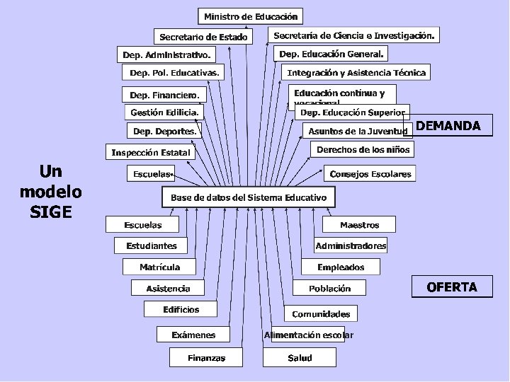 Tipología de SIGE en la práctica I. III. IV. V. SIGE como una actualización de los sistemas de información tradicionales (“Informática” con tecnología actualizada) SIGE como un sitio de Internet para la presentación de la información del sistema educativo. SIGE como un departamento – o proyecto- o sistema funcional de recolección de datos y su seguimiento. SIGE como un sistema municipal o basado en el distrito escolar para la recolección de datos y su posterior información. SIGE como un mega sistema integrado que provee información relevante, confiable, y oportuna para apoyar el desarrollo de la política educativa nacional al mismo tiempo que los objetivos educativos nacionales e internacionales se expanden.