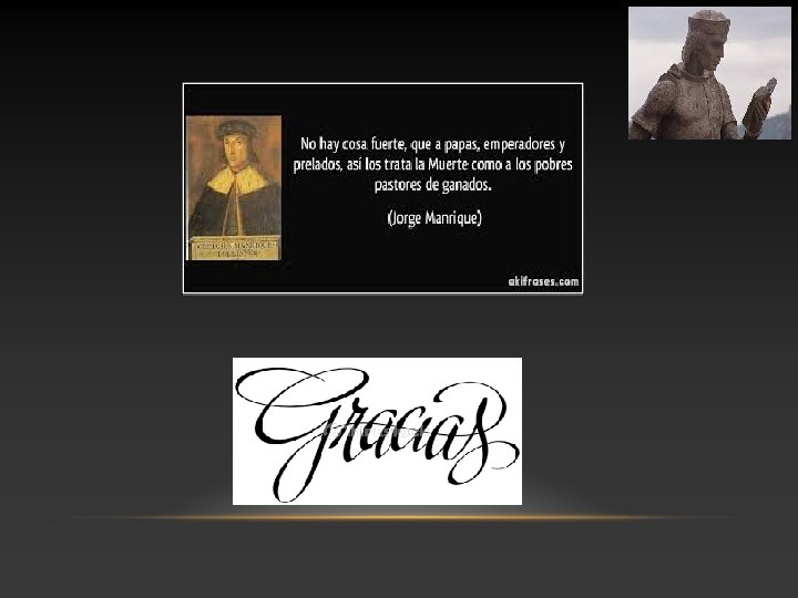 IMPORTANCIA Esta obra es la elegía más famosa de la literatura española por… la hondura y sinceridad con que el poeta expresa sus sentimientos ante la brevedad de la vida y la vanidad de las cosas mundanas. la emoción con la que transmite el elogio fúnebre de su padre. Temas y tópicos medievales. Originalidad (en el tratamiento) y tradición (temática). Las Coplas como fiel reflejo de su época: la jerarquía de los estamentos sociales, los ideales del caballero medieval, la religión como consuelo, etc. Estilo prerrenacentista. Azorín dijo: “Jorge Manrique es un escalofrío… que nos hace pensar”