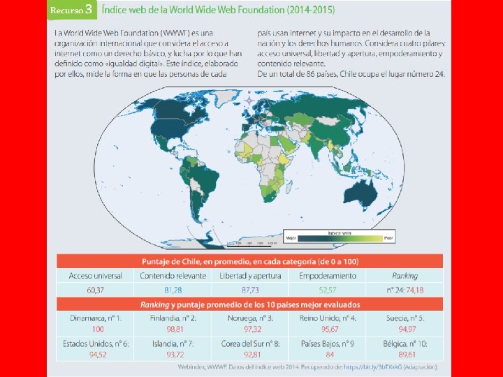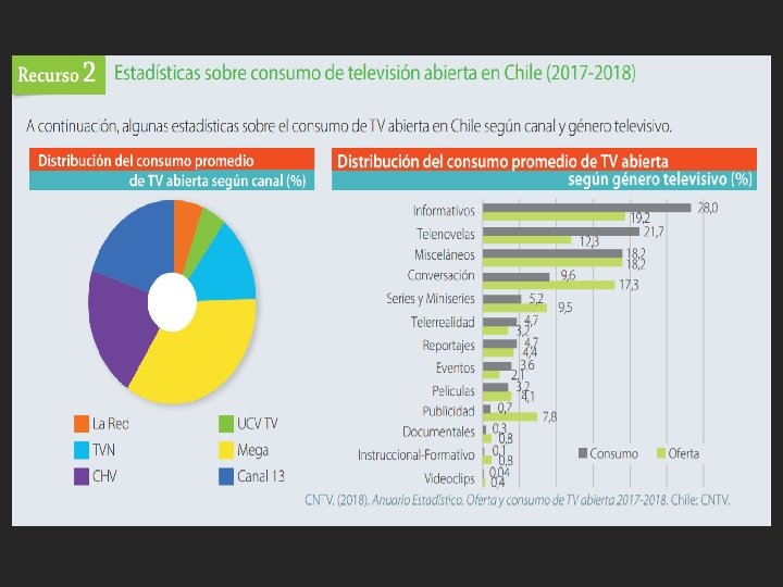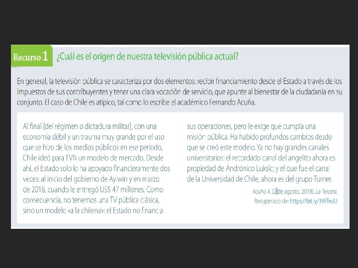 • Según la organización World Wide Web, señala que el internet en la actualidad es considerado un derecho básico y se debería lograr en los países una igualdad en este aspecto (que todos los ciudadanos pudieran contar con él). • La televisión abierta es un medio de comunicación que llega a casi la totalidad de los chilenos. • La televisión abierta en su origen fue de carácter pública, se caracterizaba por recibir aportes del Estado a través de los impuestos para hacer una televisión con vocación de servicio y que contribuyera al bienestar de la ciudadanía en general, de preferencia estuvo a cargo de las mejores Universidades de Chile (Canal 11 de la Universidad de Chile, Canal 13 de la Pontificia Universidad Católica de Chile, Canal 5 de la Universidad Católica de Valparaíso). Desde 1980 es solo supervisada por el Estado, esto quiere decir que no recibe aportes del gobierno a excepción de TVN y solo en algunas ocasiones. Hoy, los canales de televisión chilena pertenecen a privados, por ejemplo Canal 13 a la familia Luksic, Chilevisión a la empresa Turner, Mega familia Solari, Telecanal y la Red grupo Albavisión todos funcionando bajo la lógica de libre mercado.