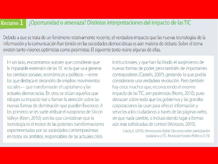 Siglo XXI: ¿estamos avanzando hacia una democracia digital? Las TIC han impactado de forma considerable en el mundo actual influenciando la manera de relacionarnos y el modo en que nos desenvolvemos como personas, pero ¿qué repercusiones tienen estas en los sistemas de representación política? ¿Es posible que nos ayuden a construir un futuro más justo, equitativo y democrático?