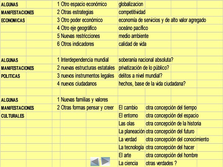 Eje geográfico Espacio económico Poder económico Restricciones económicas Indicador de riqueza Estructuras estatales Instrumentos de poder Ciudadanos Soberanía EL MUNDO TOTAL CONTINENTE-MUNDO CONOCIMIENTO - SERVICIOS CAPACIDAD DE CREAR DESARROLLO TECNOLOGICO OIGS - ONGs LEY – FUERZA INTERNALES DEL MUNDO ORGANIZACIONES GLOBO