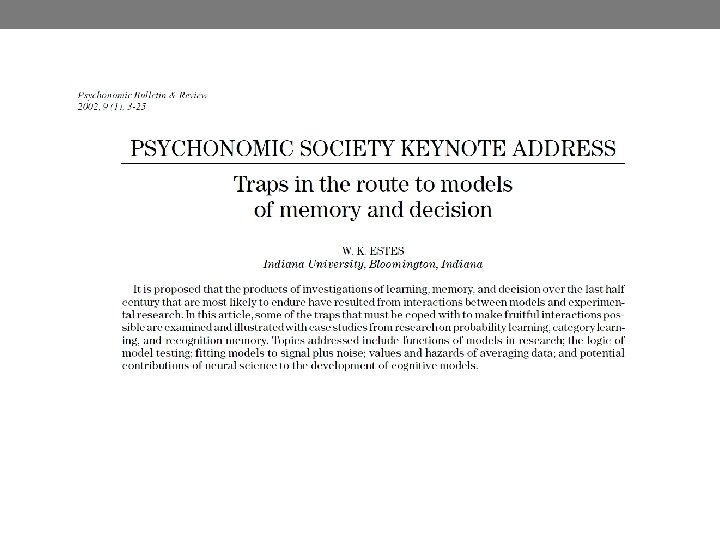 “In the early 1950 s, a well-established mathematical theory of statistical decision was used by electrical engineers as the basis for a theory of an ideal detector—that is, a machine that would yield the best possible performance at detecting faint signals in communication networks (W. W. Peterson & Birdsall, 1953). ” “Soon after success of this effort had been demonstrated, an engineer, Wilson P. Tanner, Jr. , and a psychologist, John A. Swets, proposed that human performance in perceiving near-threshold stimuli might be described by the signal detection (henceforth, SD) model. ” Over ensuing decades, the SD model, with only technical modifications to accommodate particular applications, has become almost universally accepted as a theoretical account of decision making in research on perceptual detection and recognition and in numerous extensions to applied domains (Swets, 1988; Swets, Dawes, & Monahan, 2000). This development may well be regarded as the most towering achievement of basic psychological research of the last half century.