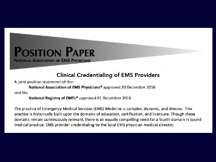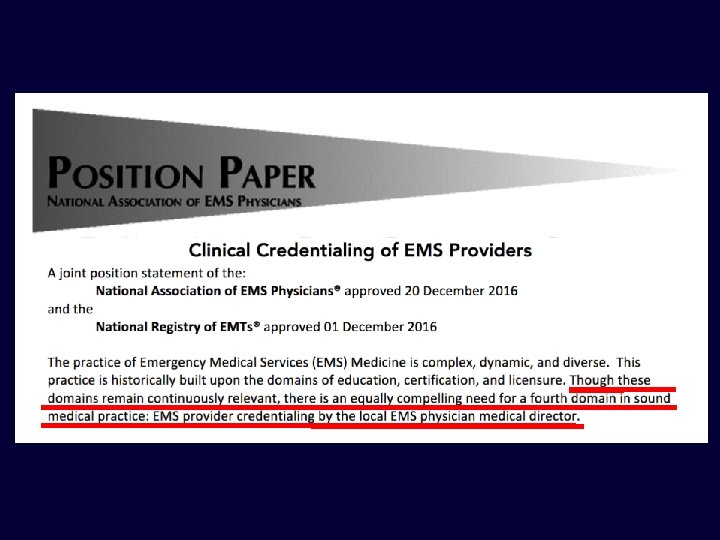 • “The public is best served when EMS providers receive externally accredited education, are nationally certified, state or provincial licensed, and when credentialed by the local EMS physician medical director. ”