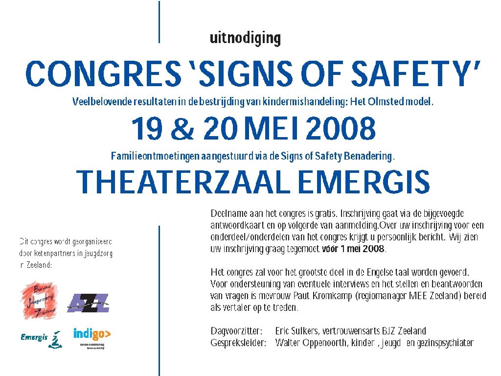 Signs of Safety Ø Ø Ø Signs of Safety: ‘Practice-based Evidence’ door Australische gezinstherapeut Turnell Geworteld in oplossingsgerichte therapie Gedetailleerde aandacht voor wat goed gaat levert energie voor gedetailleerde aandacht voor de gevaren die kind (mogelijk) bedreigen