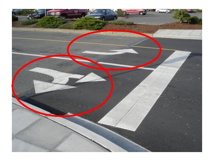 Pavement Markings o Arrows on the roadway identify lanes from which you can drive straight, or turn left or right o Shared Left-Turn Lane o Stop Line o Pedestrian Crosswalk o Road Exit Ramp o High-Occupancy Vehicle (HOV) Lane o Disabled Driver Parking