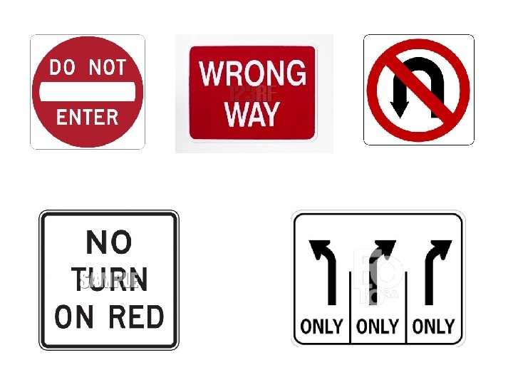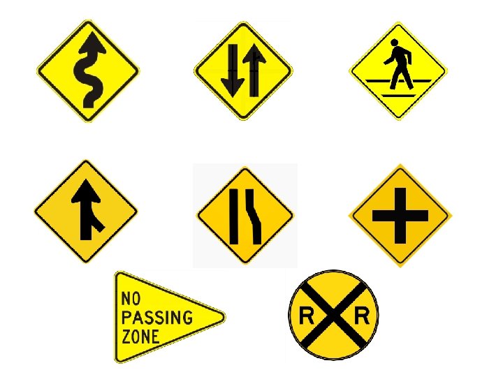 Warning Signs o Alerts you to changes in condition or use of the road ahead o All warning signs are yellow or orange with black symbols or letters o Most are diamond-shaped